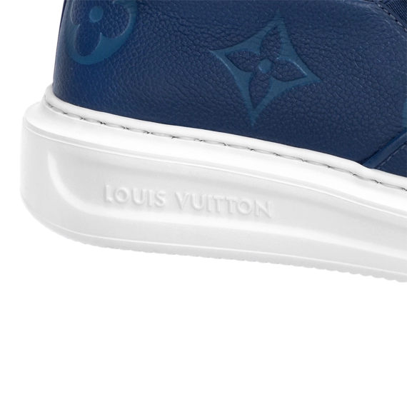 The Beverly Hills slip-on sneaker comes in supple, grained calf leather, which is embossed with an oversized version of the iconic Monogram pattern. This model is distinguished by its chunky yet lightweight outsole in white rubber, which is debossed with the Louis Vuitton signature. Discreet elastic inserts allow this model to be slipped easily on and off.