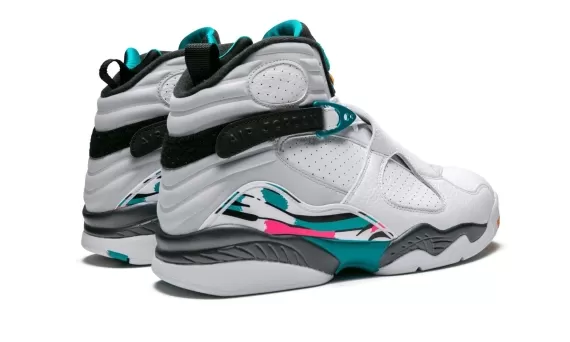 The Air Jordan 8 Retro ‘South Beach’ earns its unofficial moniker through a color scheme that presents a radical departure from the silhouette’s OG Chicago Bulls colorways. A white leather upper – featuring perforated paneling on the quarter panel – is accented with overlays adorned with streaks of Turbo Green and pink. The AJ8’... Read more The Air Jordan 8 Retro ‘South Beach’ earns its unofficial moniker through a color scheme that presents a radical departure from the silhouette’s OG Chicago Bulls colorways. A white leather upper – featuring perforated paneling on the quarter panel – is accented with overlays adorned with streaks of Turbo Green and pink. The AJ8’s signature chenille tongue patch is similarly done up in teal, pink and orange. Read less