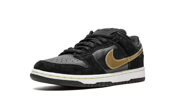 The Nike SB Dunk Low “Takashi” is a desirable colorway of the skate shoe that was designed in collaboration with Japanese pro skater Takahashi Hosokawa. The rare “Takashi” colorway of the SB Dunk Low was originally released way back in March 2003 before it was reissued in slightly more quantities in 2018. This original version of the shoe features buttery black leather on the perforated toe and mid-panel. The overlay panels are designed in supple black suede. A Metallic Gold leather Swoosh graces either side of the shoe and gold “Nike” branding is embroidered on the tonal leather heel tab. Additional gold accenting is found on the black nylon tongue tag on the shoe’s puffy black mesh tongue.