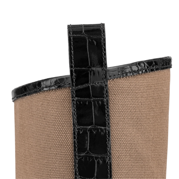 The Territory flat high ranger is a pull-on combat boot crafted from a combination of canvas and calf leather. The masculine-inspired design is balanced by feminine details, including the Monogram studs at the back and the crocodile-effect leather strap with an accessory in gold-tone metal. This model is finished with a sturdy, treaded rubber outsole.