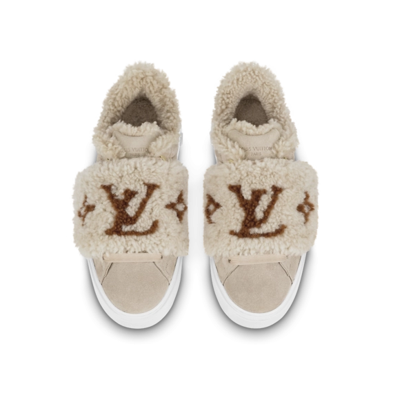 The emblematic Time Out sneaker is revisited for winter in suede calf leather with a collar and velcro strap in fluffy shearling. The strap is signed with the LV Initials and Monogram Flowers in a contrasting shade. This model is finished with an elevated, treaded outsole in tonal rubber decorated with a 3-D pattern of Monogram Flowers. Read less